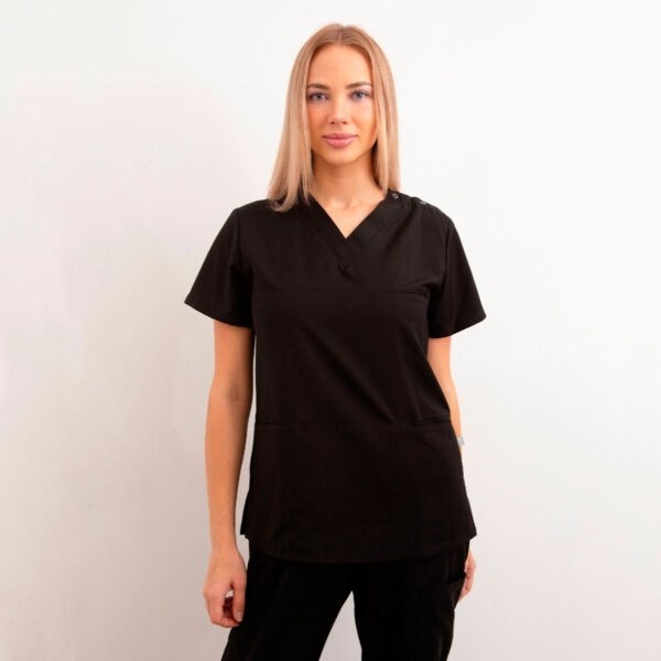 Женская медицинская туника TZ300 имеет прямой крой, короткий рукав, разрезы по бокам и V-образный вырез. Модель дополнена тремя прорезными карманами с цветной вставкой: два спереди и один на груди. Для удобства надевания на левом плечевом шве горловины имеется застежка на металлических кнопках.