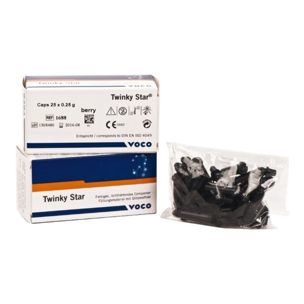 Twinky Star — цветной пломбировочный материал с эффектом блесток, разработанный специально для детей. Демонстрируя палитру цветов для будущей пломбы вы сможете вовлечь маленького пациента в процесс лечения. При выборе цвета пломбы у ребенка появляется ощущение собственного влияния на лечение. Благодаря этому, страх и нетерпение сдвигаются на задний план. Таким образом лечение станет менее стрессовым, благоприятно влияя на сотрудничество и контактность ребенка. Кроме того, у маленьких пациентов развивается продолжительный интерес к состоянию и уходу за своими зубами, поскольку новые цветные пломбы, при постоянном уходе, как можно дольше останутся «красивыми».