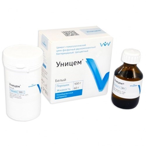 Описание: Уницем порошок -100г/жидкость -60г белыйУниверсальный усовершенствованный цинк-фосфатный цемент «Уницем», обладает высокими показателями механической прочности при сжатии (100 МПа) и химической устойчивости.