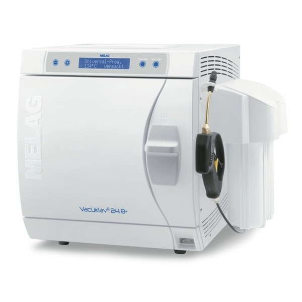 - Для большего удобства в эксплуатации Vacuklav 24 B+ можно подключить к системе водоподготовки MELAdem 40 или MELAdem 47. Часть водопроводной воды обрабатывается и используется для получения пара, другая часть используется для охлаждения вакуум-насоса. Подача деминерализованной воды и слив использованной воды производятся автоматически.