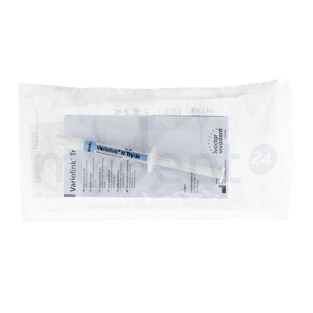 Variolink N Try-In — это водорастворимые глицериновые пасты. С помощью этих примерочных паст Try-In имитируется цвет фиксирующего композита Variolink N, который применяется для фиксации композитных и керамических реставраций, изготовленных лабораторным способом (виниры, вкладки Inlay/Onlay, коронки). Идеально подходящий цвет фиксирующего композита можно определить с помощью паст Try-In. По прозрачности и цвету пасты Try-In соответствуют полимеризованному Variolink N.