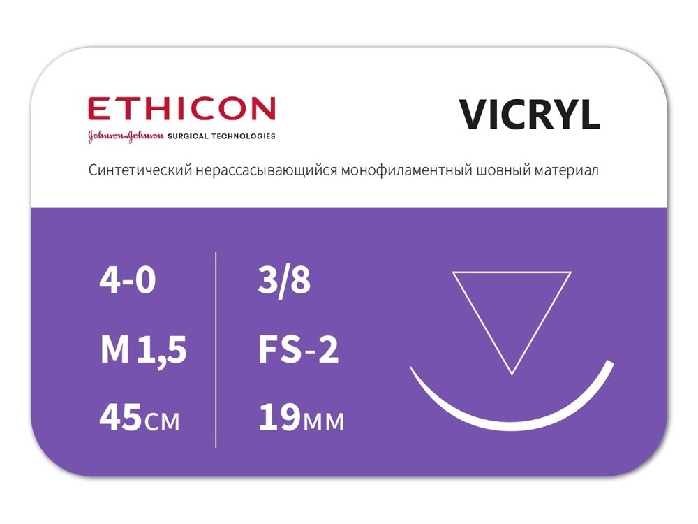 Викрил фиолетовый, 45 смW9386 ВИКРИЛ (VICRYL) 4/0 (обратно-режущая 19 мм, фиолетовый, 45 см) 12шт/упак., ETHICON (США)