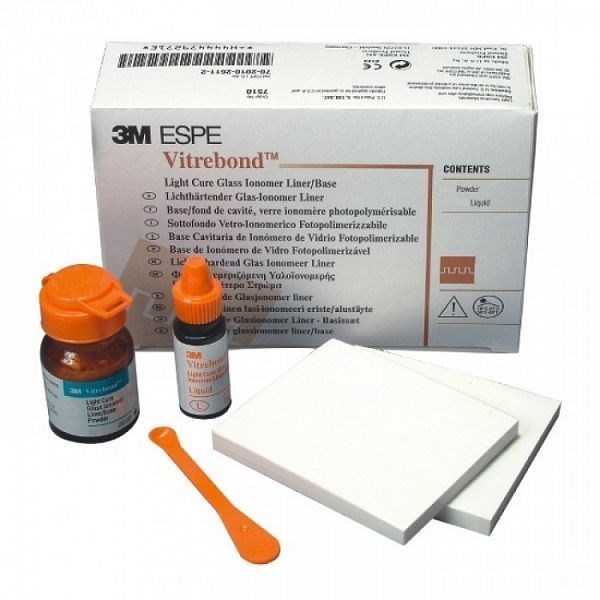 Vitrebond (Витребонд)™ - гибридный стеклоиономерный прокладочный материал с двойным механизмом полимеризации: фотополимеризация и стеклоиономерная реакция. Ознакомительный набор: 1 флакон с порошком 9 г, 1 флакон с жидкостью 5,5 мл, 2 блокнота для замешивания размером 7,5х8 см, 1 ложечка для дозирования. Срок хранения при комнатной температуре 3 года.