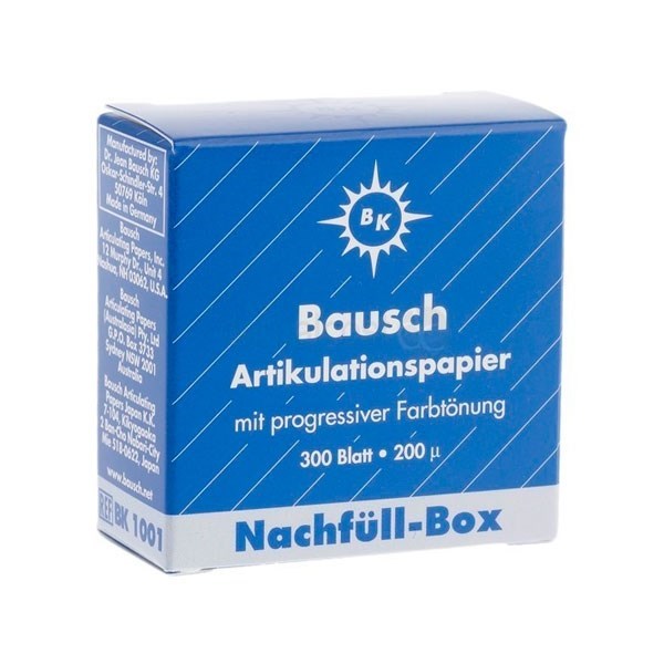 Артикуляционная бумага Бауша толщиной 200 мкм с нарастающей интенсивностью цвета является единственным видом бумаги, позволяющим представить жевательную силу различной интенсивности в виде цветных отображений с оттенками, зависящими от величины нагрузки: МАЛОЕ ДАВЛЕНИЕ ПРИ НАКУСЫВАНИИ ОТОБРАЖАЕТСЯ БОЛЕЕ СВЕТЛЫМ, А БОЛЬШОЕ ДАВЛЕНИЕ – БОЛЕЕ ТЁМНЫМ ОТПЕЧАТКОМ.