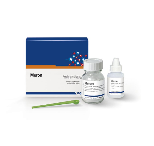 Meron – стеклоиономерный цемент (стеклополиалкеноатный цемент) для фиксации, отличается незначительной растворимостью в полости рта и незначительной кислотной нагрузкой.
