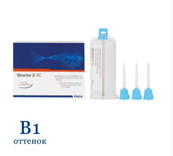 Structur 2 в оттенке B1 (картридж 75 гр.) – флюоресцирующая самоотверждаемая система «паста-паста» для изготовления временных коронок, мостовидных протезов, вкладок и накладок.