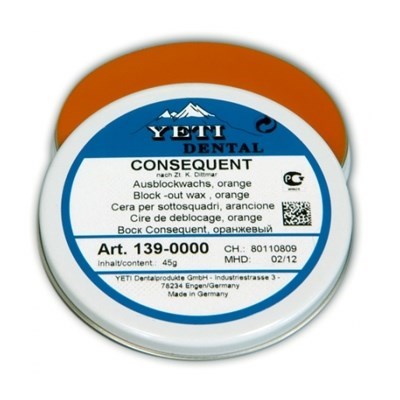 Воск CONSEQUENT наметочный. Для наметки и блокирования неровностей полостей и поднутрений. Оптимальное сцепление с металлом. Хорошая видимость даже при нанесении тонкого слоя. Хорошо режется. Не реагирует с мономерами и силиконом. Цвет оранжевый - контрастирует с гипсом. Упаковка 45 г в жестяной банке.