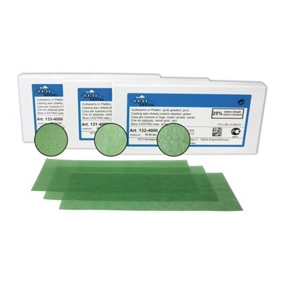 Воск литейный. В пластинах зеленого цвета. С грубым рефлением, прозрачный, легко адаптируется, без напряжения, хорошая адгезия к моделям, легко полируемая текстура. Размер пластин 17,5 х 8,0 см, толщина пластины 0,50 мм. Упаковка 15 пластин.