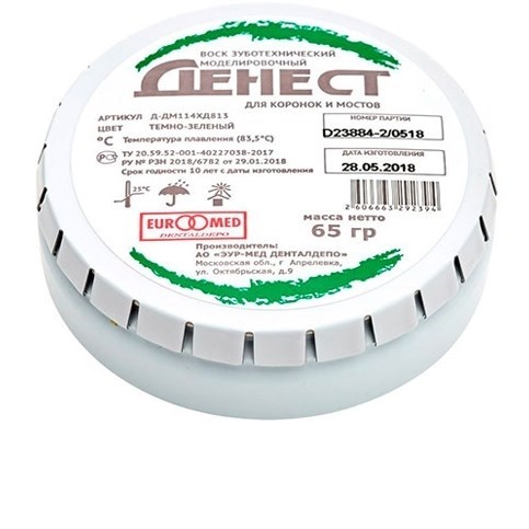 Описание: Воск моделировочный ДЕНЕСТ для коронок и мостов (темно-зеленый) 65гВоск зуботехнический моделировочный Денест для техники коронок и мостов (темно-зеленый), 65г, предназначен для моделирования жевательных поверхностей и стенок коронок, промежуточных частей мостовидных протезов.