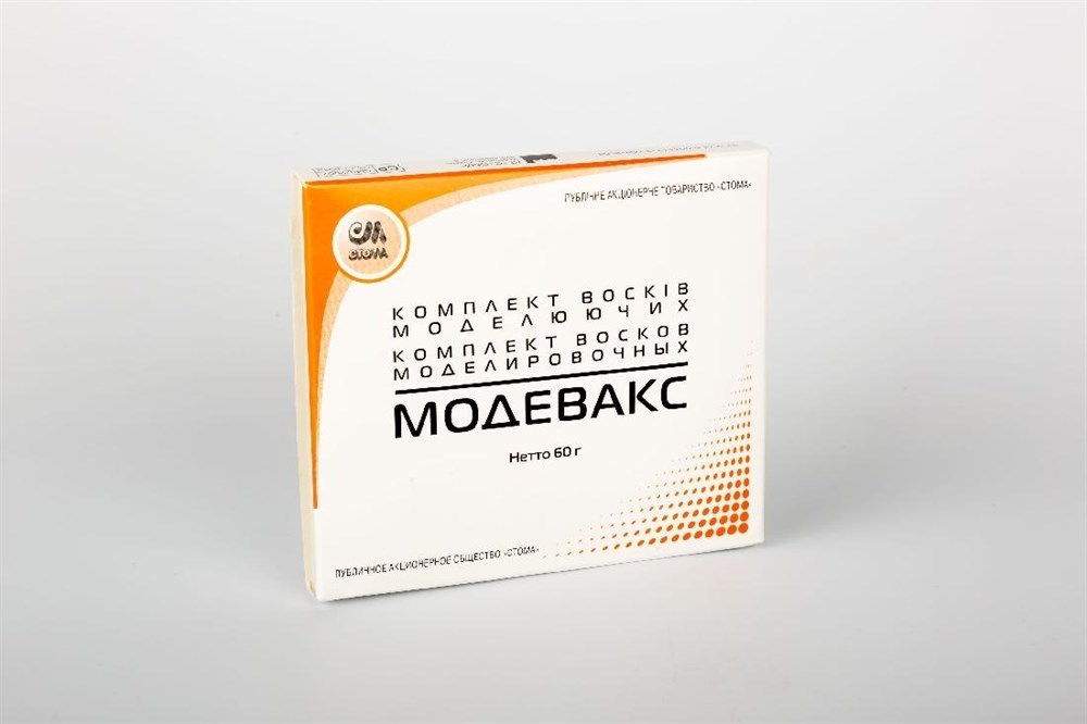 Воск Модевакс. Комплект восков для моделирования несъемных цельнолитых металлокерамических и металлополимерных протезов. Хорошо обрабатывается зуботехническим инструментом, легко поддается моделированию. Композиция на основе парафина, церезина, натуральных и синтетических восков. Выпускается в форме палочек набором из трех восков: красного, синего и зеленого цвета общий вес 60 г.