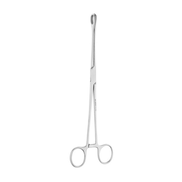 Зажим удлиненный. Инструмент для захвата и удержания с длиной не менее 24 см. Рабочие части имеют уплощение в форме круга и поперечный ретенционный узор, обеспечивающий надежную фиксацию при сближении противопоставленных рабочих частей.. Снабжен кольцевыми держателями и стандартным нажимным трехступенчатым фиксатором. Острые углы в местах смыкания инструмента сточены.