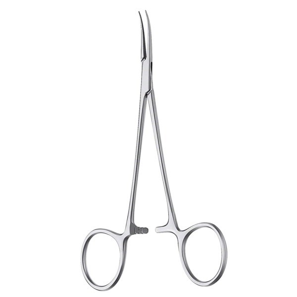 Кровоостанавливающий зажим с изогнутой рабочей частью. На щечках есть насечки, которые обеспечивают надежный захват.