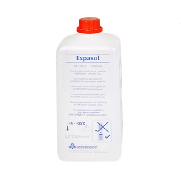 Универсальная жидкость EXPASOL используется для замешивания паковочных масс Interfine K+B Speed, Intervest K+B Speed, Modelcast S и Modelcast. Используя одну и ту же жидкость для съёмного и несъёмного протезирования можно избежать ошибок, если бы использовали различные жидкости, а одновременно и сокращаются расходы. Чувствительна к температуре ниже 4°C.