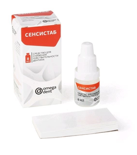"СЕНСИСТАБ" отличается легкостью нанесения и биологической совместимостью с мягкими тканями. Он не обесцвечивает эмаль и не отличается токсичностью.