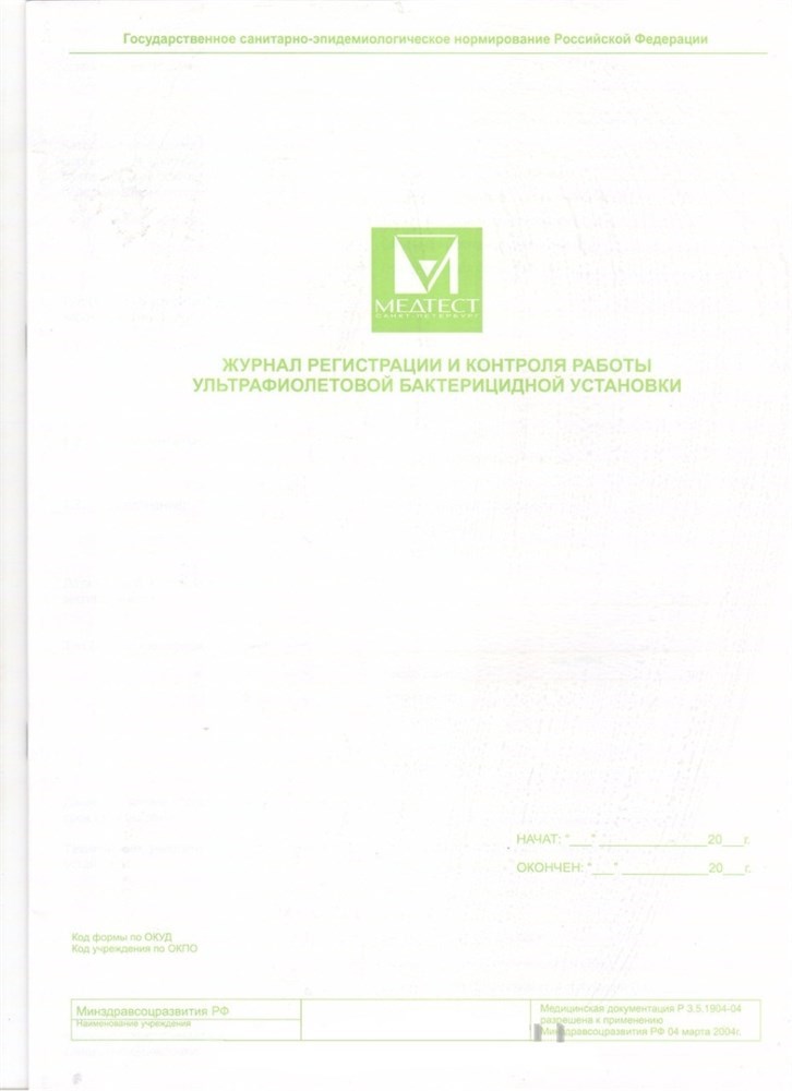 Журнал регистрации и контроля работы ультрафиолетовой бактерицидной установки