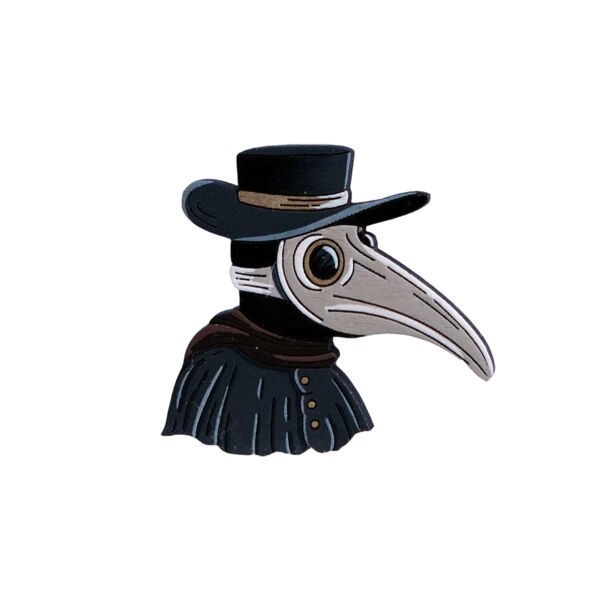 Деревянная брошь "Чумной доктор" вручную расписана акриловыми красками. Сверху покрыта защитным слоем лака, чтобы краски сохраняли свой первоначальный вид. Крепится брошь на булавку, которая расположена с тыльной стороны броши.