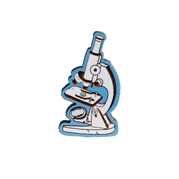 Значок из дерева «Микроскоп» с оригинальным дизайном. Раскрашен вручную и покрыт защитным слоем лака. Крепление сзади — металлическая булавка. Значок крепится на фирменную открытку.