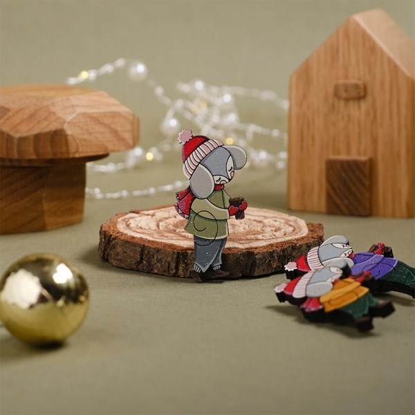 Цветной мышонок из дерева разрисован акриловыми красками и покрыт защитным лаком, чтобы покрытие дольше сохранилось. Значок крепится на булавку сзади.