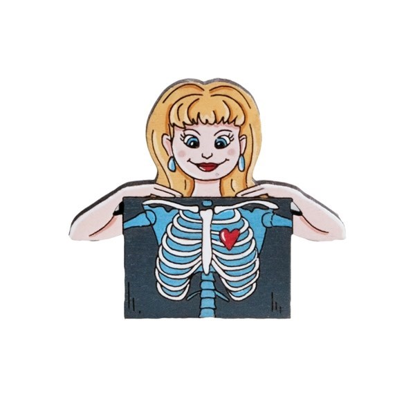 Значок из дерева для врача рентгенолога. Брошь раскрашена вручную и покрыта защитным слоем лака. Крепление сзади — булавка.