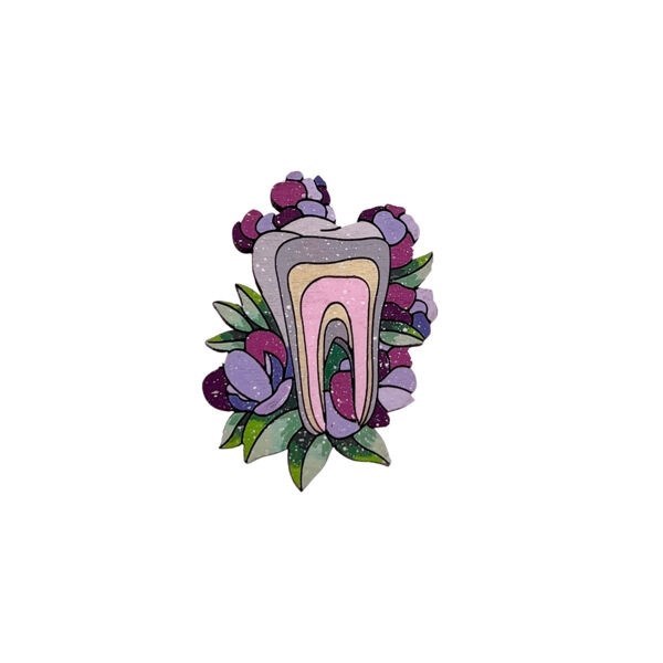 Значок “Зуб в цветах” — яркий аксессуар украсит униформу, добавит настроения на весь день. Сделан из дерева, раскрашен акриловыми красками вручную и покрыт лаком для сохранения яркости красок. Крепится на булавку, которая расположена с тыльной стороны значка.