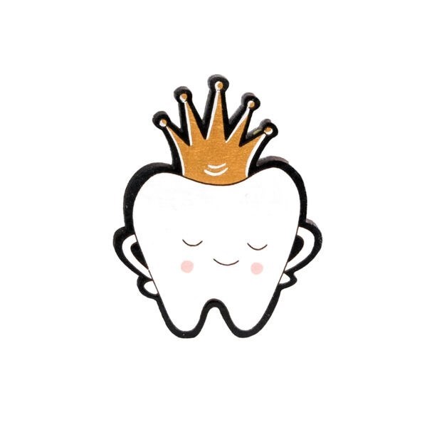 Деревянная брошь «Зуб с короной» для врача стоматолога. Раскрашена вручную и покрыта лаком. Каждый значок закреплен на тематическую бирку-открытку и дополнен крафт-пакетом.