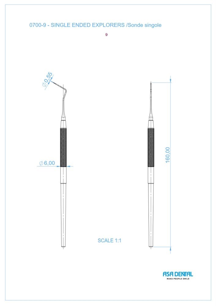 Зонд № 9 односторонний, изогнутый. Тонкий стержневой инструмент, предназначенный для обнаружения кариеса зубов. Рабочая часть зонда - "зубец (острие)" который крепится к ручке и составляет его часть - острая, прямая с двойным изгибом. Форма F в соответствии с ГОСТ Р 50564-93. Специальная насечка для облегчения удержания инструмента. Угол изгиба рабочей части составлят 25 градусов относительно оси ручки. Угол изгиба рабочей части 90 градусов. Ручка, в месте удержания, цилиндрической формы со специальной насечкой и коническим утончением к концу. Длина изогнутой рабочей части не менее 15 мм. Общая длина 160 мм. Не смываемая лазерная маркировка на конической части ручки с обозначением производителя и каталожным номером.