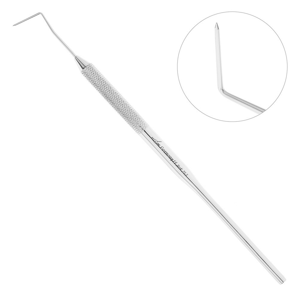 Рабочая часть одностороннего инструмента имеет одиночный изгиб по ребру и острый удлиненный кончик, благодаря которому зонд легко вводится в десневую борозду и даже глубокие кариозные полости. Применение диагностического инструмента происходит без травмирования мягких тканей.
