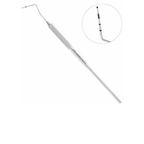 Для повышения мануального контроля рукоятка зонда выполнена в виде цилиндрического стержня, который фиксируется в руке как «писчее перо». На внешнюю поверхность ручки стоматологического инструмента нанесены продольно-поперечные насечки, препятствующие скольжению фаланг пальцев в перчатке в процессе работы.