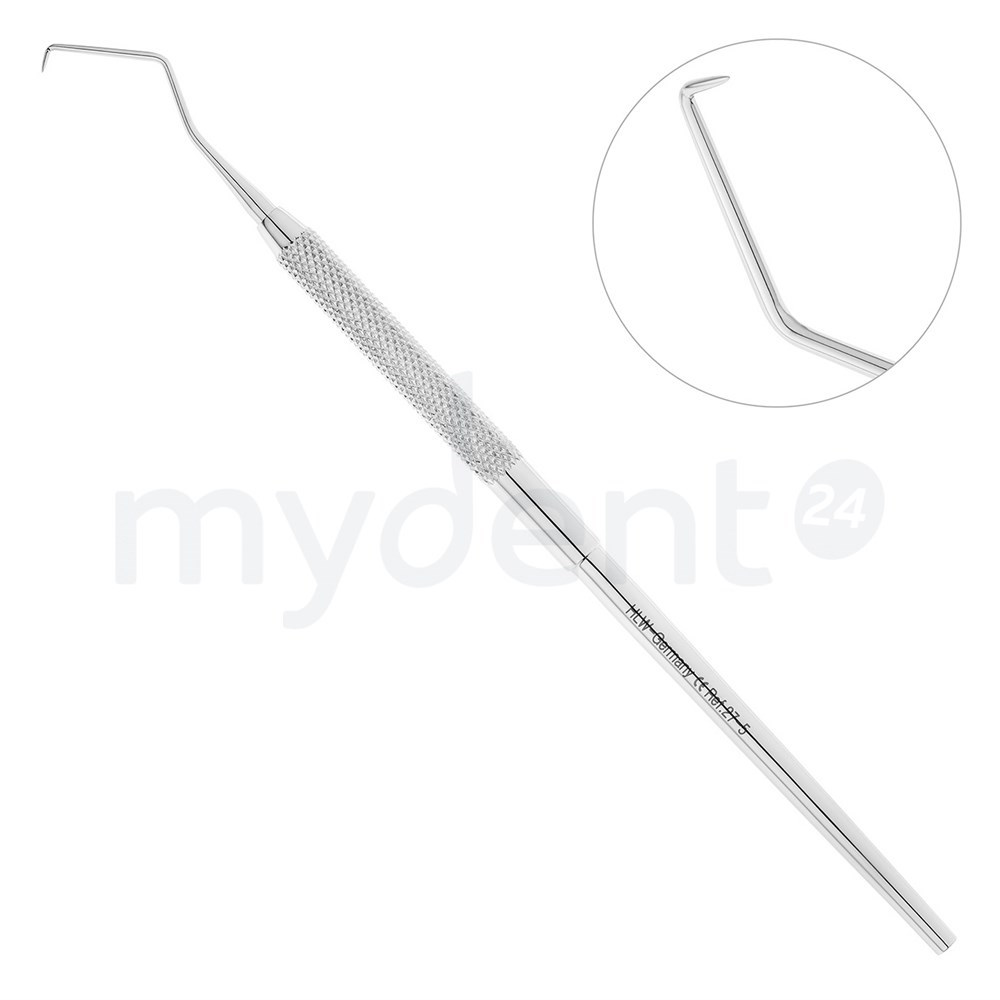 Рабочая часть одностороннего инструмента имеет изгибы по ребру и заостренное окончание. Благодаря такой конструкции стоматологический зонд очень удобен в использовании и он без затруднений вводится в глубокие и труднодоступные участки ротовой полости.