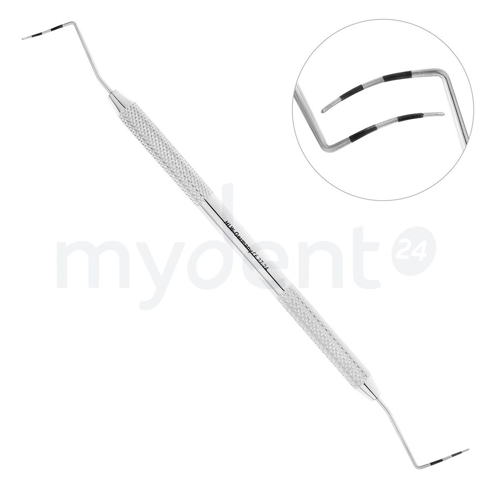 С обоих концов двусторонней рукоятки зонда расположены зеркально отраженные рабочие части, каждая из которых имеет изгиб по плоскости и уплощенный конец. На внешние поверхности рабочих частей инструмента нанесены цветовые маркировки в миллиметрах, благодаря которым можно легко обнаружить и определить глубину периодонтальных карманов.