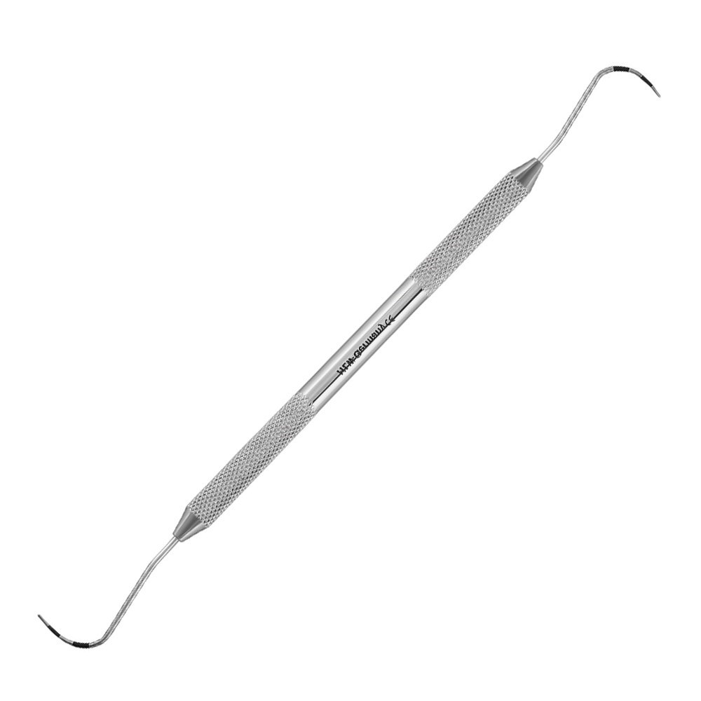 С обоих концов двусторонней рукоятки зонда расположены зеркально отраженные рабочие части, каждая из которых имеет серповидную форму, изгиб по плоскости и уплощенный конец. На внешние поверхности рабочих частей инструмента нанесены цветовые маркировки в миллиметрах, благодаря которым можно легко обнаружить и определить глубину периодонтальных карманов.