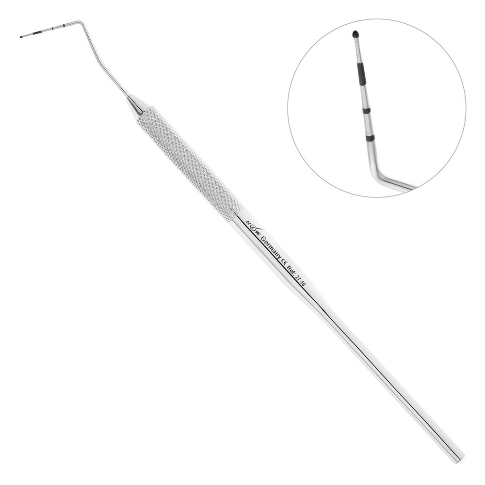Стоматологический инструмент имеет одну рабочую часть с шаровидным кончиком, который минимизирует травматизацию соединительной ткани. Внешняя поверхность рабочей части зонда маркирована. Градация соответствует 3,5 мм, 5,5 мм, 8,5 мм и 11,5 мм. Для облегчения считывания между метками 3,5 мм и 5,5 мм нанесена черная полоса.