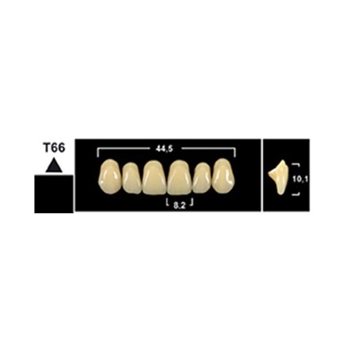 Зубы Yeti A3 T66 фронтальная группа, верхние (Tribos) 6 шт. Германия. Tribos - акриловые зубы нового поколения. Главное достоинство этих зубов - ярко выраженная окклюзионная поверхность моляров, превосходные эстетические качества.